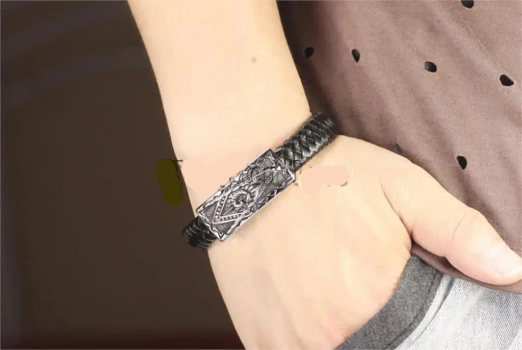 Vintage Mens Freemasonry Masonic Mason Black PU Leather Bracelet Cuff Braided Charm Bracelet
